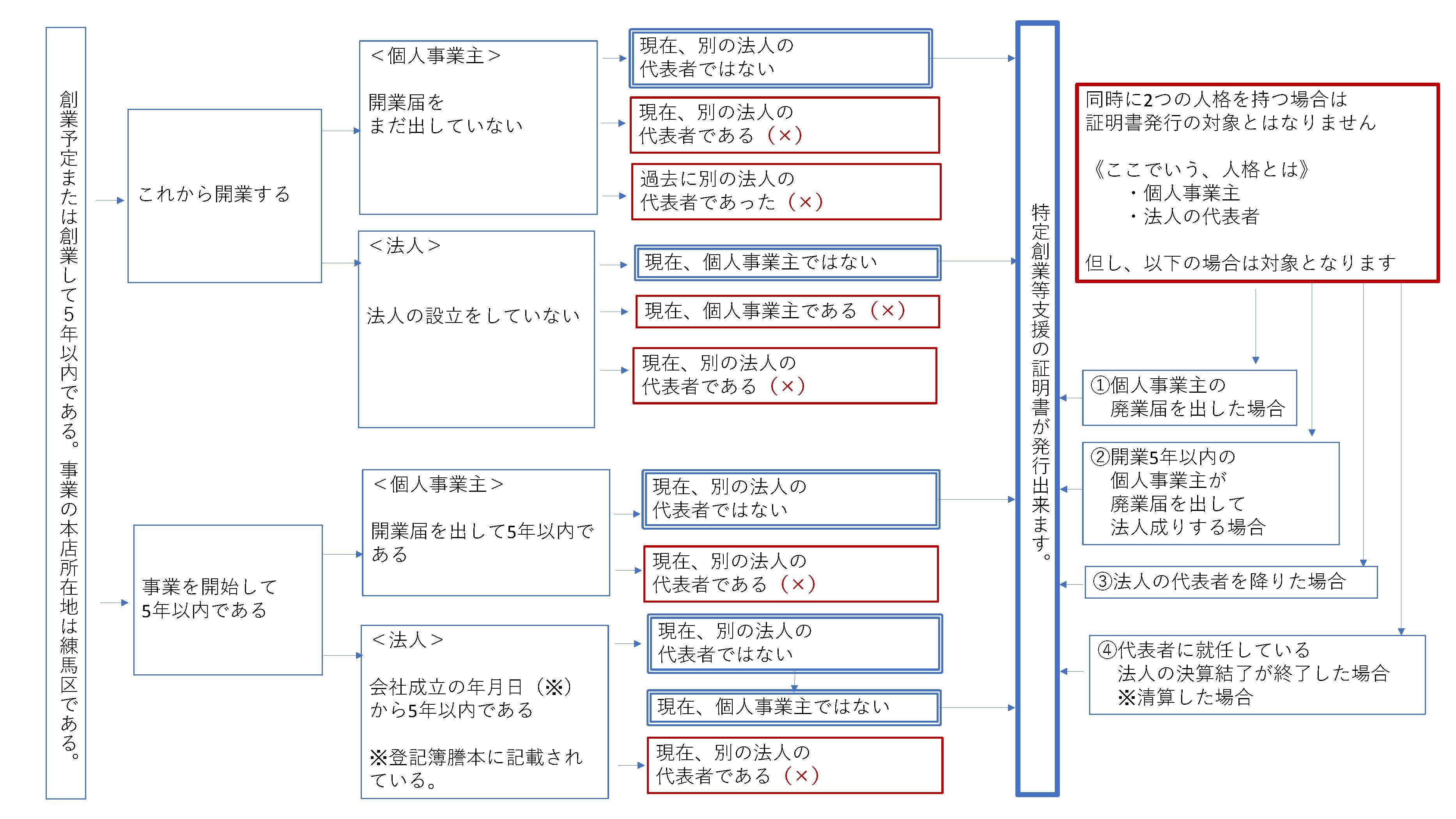 練馬区の指定する特定創業支援等事業を受け、区が発行する「特定創業支援等事業による支援を受けたことの証明(証明書)」の交付を受けることで優遇措置を受けることができます。